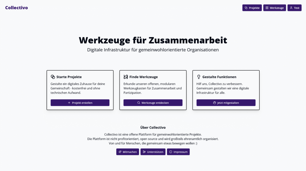 Collectivo entwickelt eine geteilte digitale Infrastruktur für gemeinnützige Projekte – mit dem Ziel, das Internet als offen zugängliche Ressource für Zusammenarbeit und demokratische Teilhabe zu stärken. Wir schaffen ein erweiterbares Ökosystem digitaler Werkzeuge, das sinnstiftende Initiativen und Organisationen dabei unterstützt, ihre Prozesse zu vereinfachen sowie Mitbestimmung und gemeinschaftliches Handeln zu fördern.